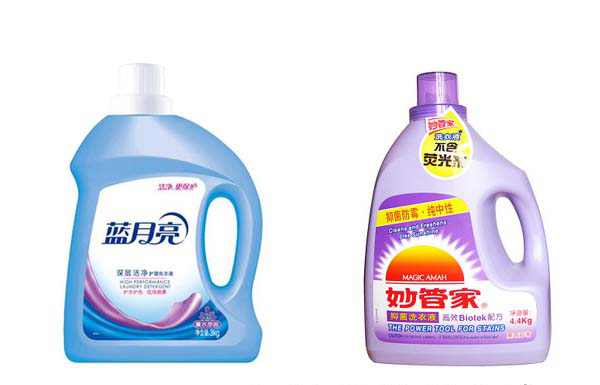 左邊的洗衣液瓶就是只貼單面的。右邊的那個洗衣液瓶要貼三張不干膠標簽。雙側(cè)面要貼,而且還要在頸部部一張。這個有點難度,但是可以貼,用非標準機就可以加工了。