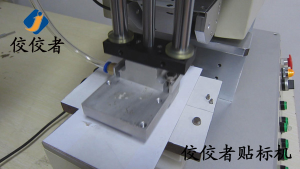 正常操作的時候工作人員將需要貼標的手機殼放在方便拿取的位置以增加貼標的效率,此時有一個步驟在圖片中沒有展示出來,那就是接通電源之后,需要做的就是將手機殼放在治具(固定產品用的模具,可根據產品的不同進行定制)中.然后踩腳踏,此時貼標過程已經完成.看似只有一秒鐘的時間,在這個時間中,機器進行了一系列的工作.吸標頭向下垂直運動到指定位置,標簽剝離機構同時出標,當標簽出到1/2處時,吸氣裝置啟動,吸住標簽,待標簽完全剝離,標簽也完全被吸在貼標頭上了,此時貼標頭向下貼標,到指定位置,這里說的就是產品放置的位置了.至此,貼標過程就已經完成了。(操作過程:放產品—>貼標并覆標(設備自動實現)—>取出已貼標產品。)如下圖:
